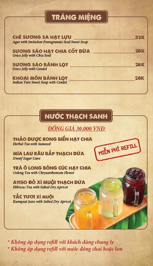 Lẩu Cua ĐồngSốt - Rang Cua ĐồngMón Miệt VườnGỏi đồng quêMón cuốn dân dãBún Riêu & Bánh đaGiải khát & Tráng miệng