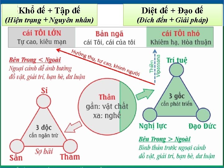 4 diệu đế và 3 gốc - 3 độc: Tham Sân Si (bản ngã lớn) 1) Khổ đế là 1 sự thật trong đời sống (hiện trạng) 2) Phải có Nguyên nhân = tập đế Khổ khổ = sân / Hoại khổ = tham / Hành khổ = si 3 gốc: Giới Định Tuệ (bản ngã nhỏ => vô ngã) 1) Diệt đế = Diệt khổ đế = Hết khổ (đích đến) 2) Đạo đế = Giải pháp = 8 chánh đạo (3 gốc) Khổ đau & hạnh phúc. . Hài lòng & Tự do. . . Cách các thầy tư vấn tâm lý, tìm hiểu 1 người đến hỏi. . Vô thường (biến hoại, biến đổi), khổ (bất như ý), vô ngã (không thực)