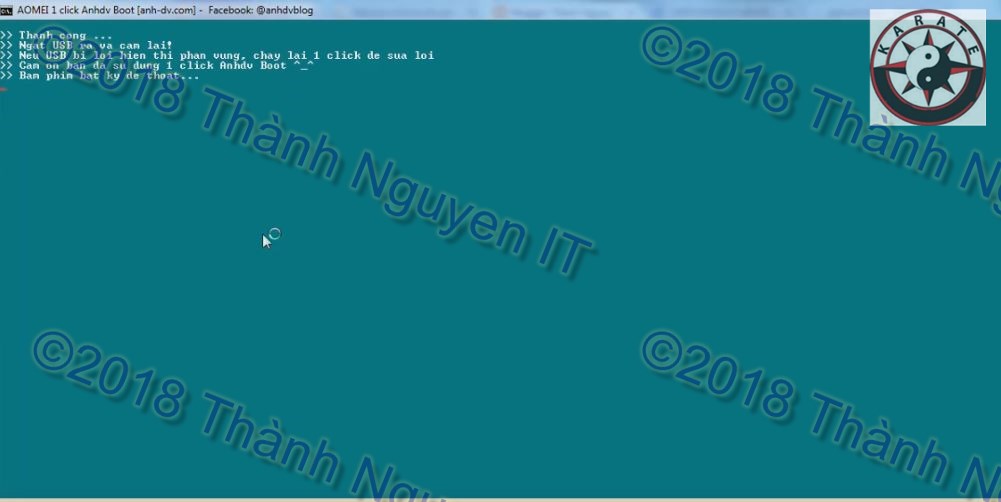 Quá trình tạo boot Bước 8: Sau khi công cụ 1 click tạo usb boot chạy xong và xuất hiện thông báo như hình dưới đây thì các bạn bấm một phím bất kỳ để thoát nhé.