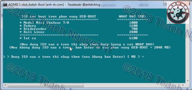 Format để tạo boot Bước 6: Nếu muốn sử dụng thêm Mini Windows 7/8 thì nhập thêm 1000 MB (có thể nhập 1024 để chẵn 1GB). Lúc này dung lượng phân vùng USB-BOOT sẽ là 2048 + 1000. Dùng thêm Fedora, Bitdefender, Kali thì lại cộng thêm. Nếu dùng tất cả các ISO liệt kê ở trên, bạn cần nhập 6100. Trong trường hợp không dùng ISO nào trong danh sách, bấm phím Enter. Công cụ sẽ tạo usb boot uefi legacy với dung lượng 2048 MB (2GB).