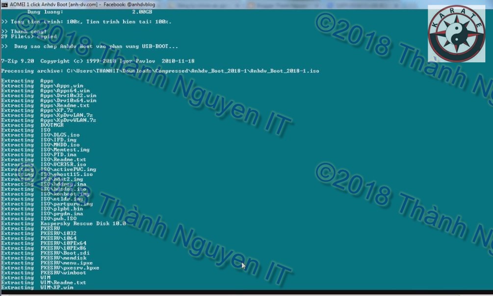 Cập nhật anh-dv boot Các việc còn lại giống hệt ở bước 7 trở đi của bước tạo mới. Tất cả việc bạn cần làm là ngồi rảnh để công cụ tự làm việc. TẠM KẾT Như vậy mình đã hướng dẫn các bạn cách tạo 1 usb boot cứu hộ chuẩn UEFI - LEGACY bằng công cụ anh-dv boot 2018. Nếu như có thắc mắc gì hoặc có lỗi xảy ra trong quá trình tạo boot. Các bạn hãy inbox mình để mình tìm và sửa lỗi cho các bạn nhé. Chúc các bạn tuần mới vui vẻ. Nguồn: Thanh nguyen IT Sửa lần cuối: 4/1/18 Rìu Sắt