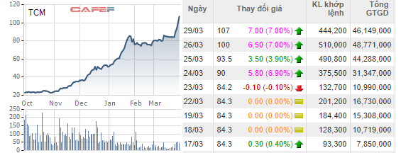 Đáng chú ý, thời điểm ông Nghĩa trở thành cổ đông lớn vào đầu tháng 10/2020, giá cổ phiếu TCM cũng bắt đầu dậy sóng và liên tiếp leo dốc lên đỉnh giá 107.000 đồng/cp chốt phiên ngày 29/3, tăng gấp 5 lần kể từ đầu tháng 10/2020. Trong 4 phiên gần đây, TCM có ba phiên tăng trần.