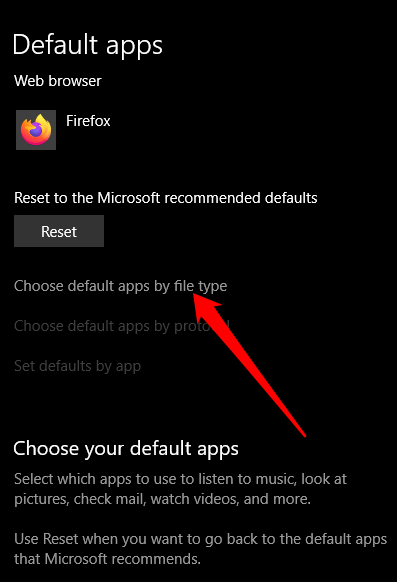 - Cuộn xuống và chọn Chọn ứng dụng mặc định theo loại tệp nếu bạn muốn các tệp MHT của mình tự động mở bằng một ứng dụng ngoài ứng dụng mà Microsoft đã cung cấp.