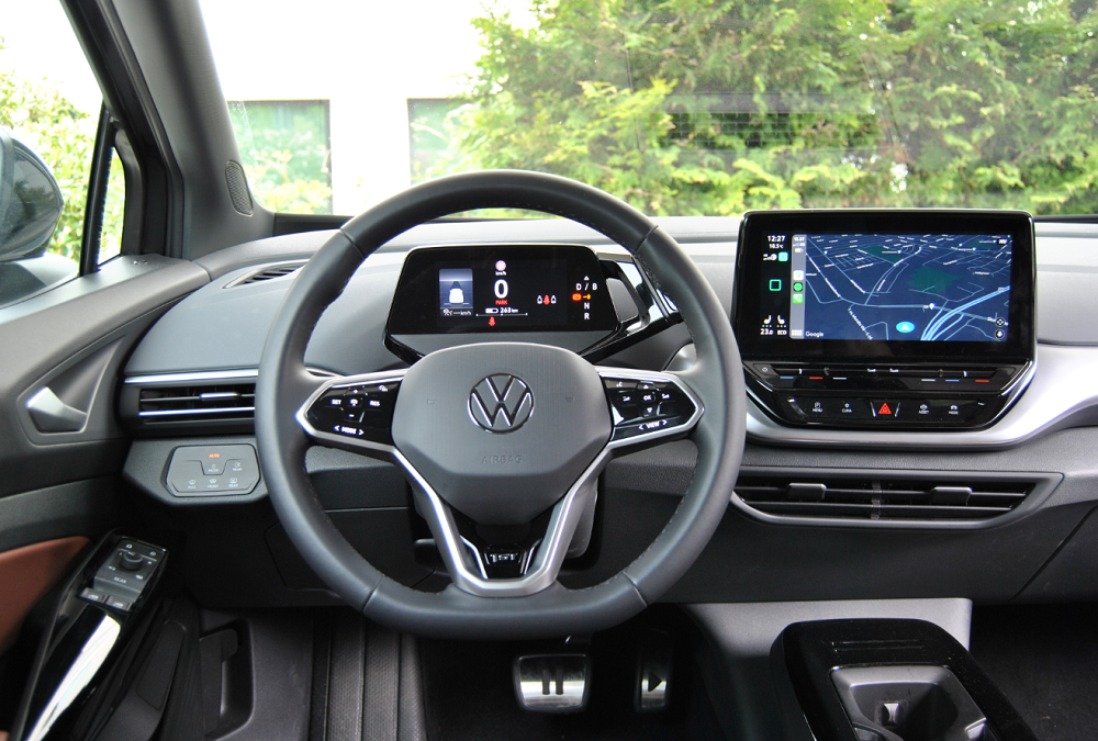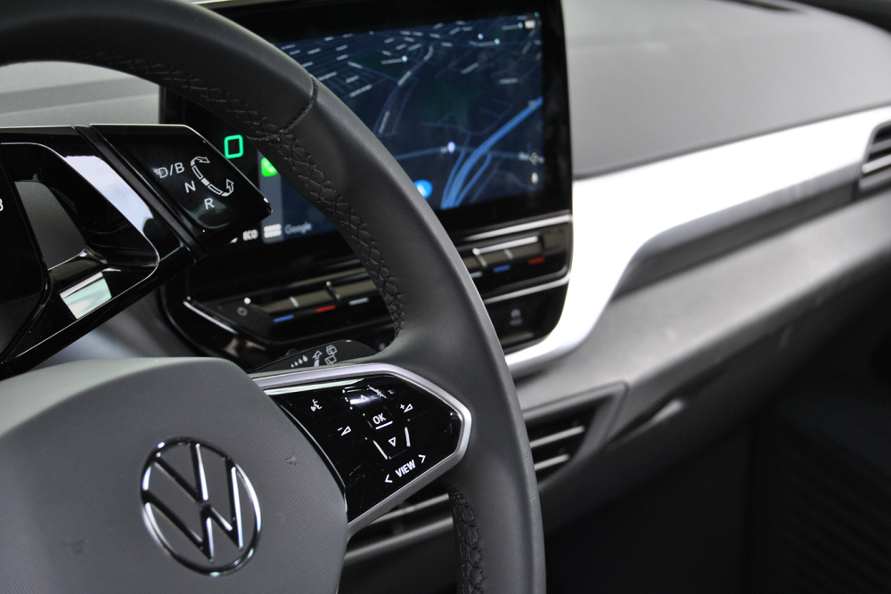 Indretningen i kabinen er en helt ny stil fra Volkswagen. Tag bare cockpittet, som har fået en lille og simpel skærm, der følger rattet, når du justerer det op eller ned. Smart! Skærmen fortæller dig primært hvor hurtigt du kører, den tilladte hastighed og en visning af vejbaneassistenten og den adaptive fartpilot samt gearindikator. Og så er der et lille ikon som på en smartphone, der indikerer, hvor meget strøm du har tilbage.