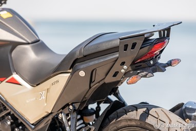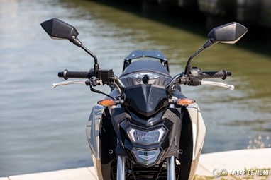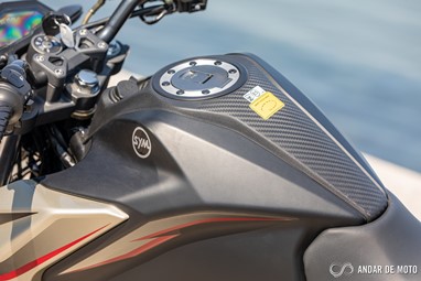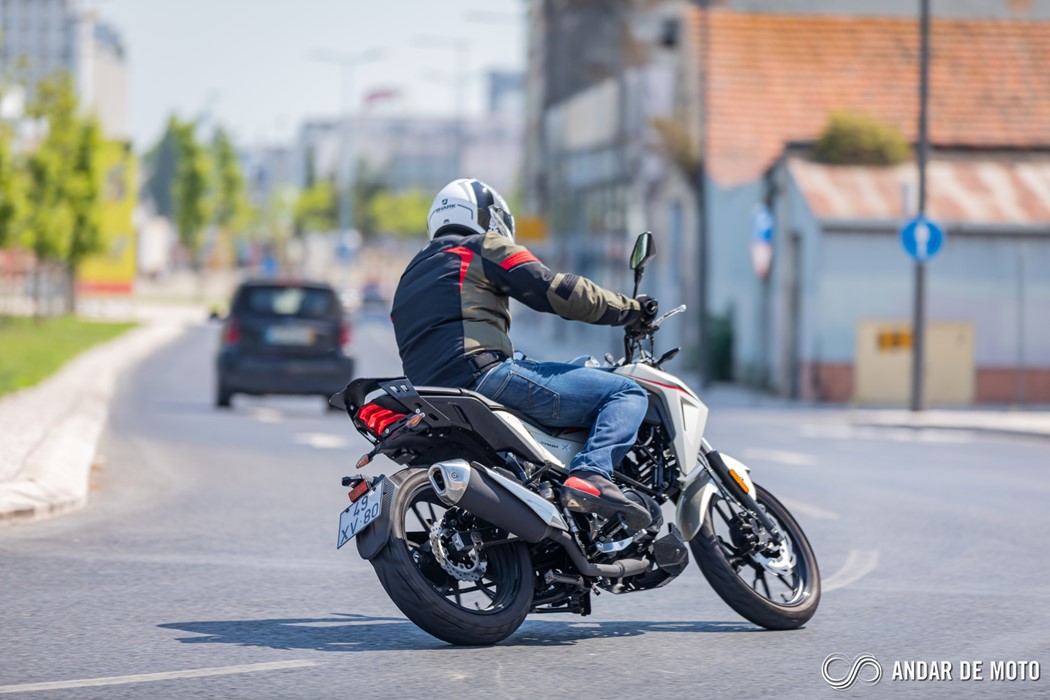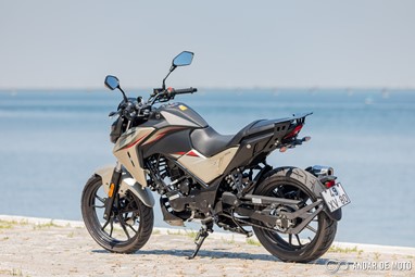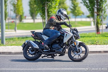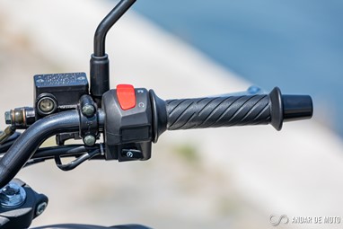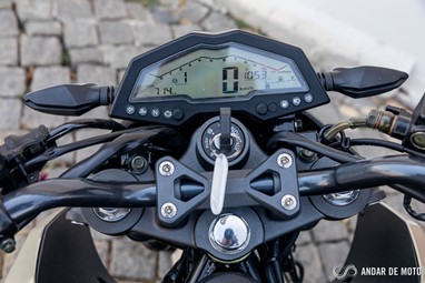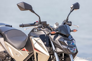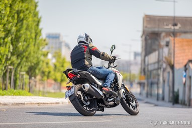 No entanto a qualidade de construção não está, claramente, ao nível da Honda. A NH-X 125 tem bastantes cabos à vista, alguns plásticos não têm um toque particularmente agradável e a qualidade parece algo frágil. Pelo contrário, os plásticos que simulam fibra de carbono são agradáveis, o assento generoso está coberto por material anti-deslizante, e o painel de instrumentos digital está bem conseguido e mostra as informações de forma facilmente legível. Com dimensões generosas para uma “oitavo de litro”, a SYM NH-X 125 não se revela intimidante quando estamos aos seus comandos. O assento está posicionado a apenas 787 mm de altura, o que nos deixa bastante “dentro” do conjunto e facilita chegar com os pés ao solo. Não me recordo nos tempos recentes de ter testado uma naked roadster que fosse tão baixa. A posição de condução, para condutores de estatura mais elevada, pode ser algo estranha. O guiador é alto e curvado para trás. Isso deixa os punhos bastante perto do condutor. É um guiador estilo “old school” e totalmente o oposto das mais atuais naked. Isso resulta numa posição de condução algo acanhada. Mas se for um condutor de estatura menor, vai sentir-se extremamente à vontade, com uma posição de condução que favorece a manobrabilidade em cidade.