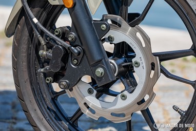 Ao nível da travagem também não encontramos nada de novo. Um sistema combinado, com dois discos (260 mm à frente e 222 mm atrás). O tato inicial da manete é esponjoso, mas assim que apertamos com mais força a pinça morde com alguma ferocidade o disco recortado. Neste caso, a forquilha revela uma tendência de afundar rapidamente, pelo que convém estar precavido para este comportamento e ajudar a reequilibrar o conjunto reposicionado o corpo mais para trás no assento. De uma forma geral não é necessário usar o travão traseiro, mas numa condução mais desportiva, e se quisermos mesmo levar a travagem para o limite, convém usar o travão traseiro para ajudar a distribuir o esforço da travagem. Em condução, é fácil gostarmos da SYM NH-X 125. A posição de condução natural ajuda a descontrair. A brecagem não é a melhor, mas por outro lado o peso do conjunto é de apenas 142 kg, o que faz com que as trocas de direção e as manobras a baixa velocidade não sejam um problema.