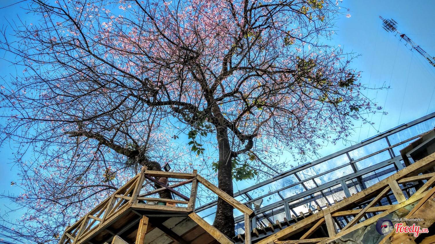 Quán cà phê với các mặt kính trong suốt nhìn ra bên ngoài, khu vườn nhỏ với cây đào hồng đang khoe sắc gây ấn tượng với du khách. Ảnh: Ăn Hết Thế Giới 🍗🍟🥘 on Instagram