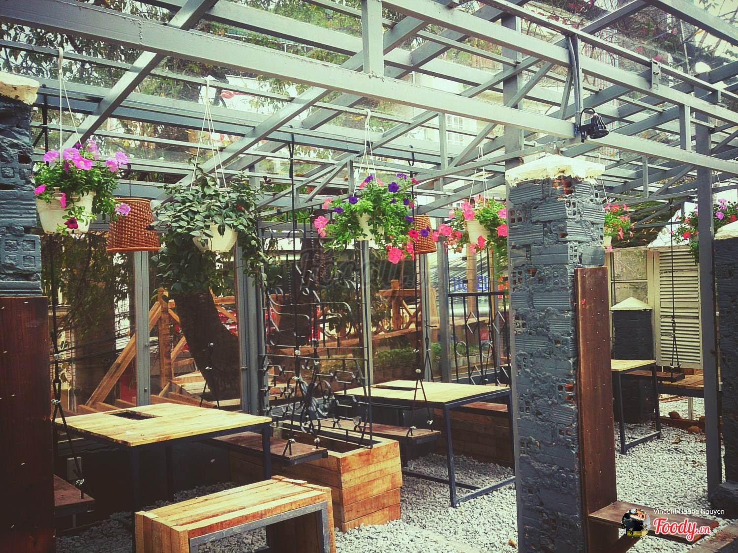 Với diện tích hơn 200 m2, quán có hai không gian chính là ngoài trời và trong nhà với nhiều khu tách biệt. Cách bày trí ở mỗi khu vực đều có phong cách riêng, ấy vậy vẫn có sự liên kết với nhau, tạo cảm giác mới lạ.