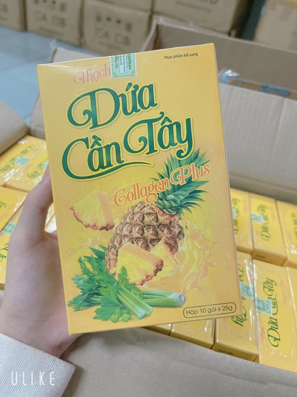 - Thạch Dứa cần tây collagen hộp 10 gói xóa tan mỡ bụng Sỉ: 28,600đ Thùng 60: 27,500đ giá sỉ/bán buôn