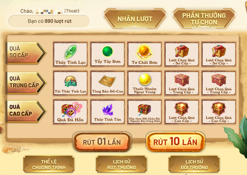 - Bảng rút thưởng bao gồm 3 loại phần thưởng Sơ - Trung - Cao, tương ứng với phẩm chất phần thưởng.