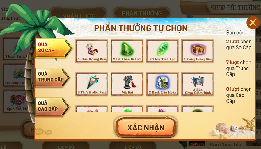 - Quay vào các ô “Lượt Chọn Quà Sơ – Trung – Cao” sẽ được lượt tự chọn vật phẩm, Đại hiệp vào giao diện “Phần Thưởng Tự Chọn” để lựa chọn phần thưởng muốn nhận. Sau khi bấm xác nhận, phần thưởng sẽ được trao vào thư trong game.
