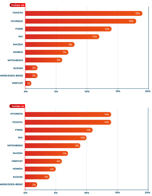 Theo báo cáo của Hiệp hội ô tô Việt Nam (VAMA), doanh số bán xe mới tháng 10/2020 đạt 33.254 xe, gần bằng mức kỷ lục của tháng 12/2018. Ngược lại, mức tiêu thụ tháng 10 của VinFast giảm mạnh 21%, Hyundai giảm nhẹ 5,3%. Tính chung số liệu của VAMA, VinFast và TC Motor, doanh số bán xe mới tháng 10 đạt 43.959 xe, tăng 12,5% so với tháng trước, giảm 19,8% so với tháng 9/2019. Khảo sát 35.000 tin rao bán xe trên Oto.com.vn cho thấy trong tháng 10, Hyundai đã vượt Toyota về số lượng tin rao bán để vươn lên dẫn đầu, VinFast vươn lên vị trí thứ 6 trong top 10 hãng xe mới được rao bán nhiều nhất. Sự thay đổi thứ tự này hứa hẹn sự tăng trưởng doanh số trở lại 2 hãng này ngay trong tháng 11.