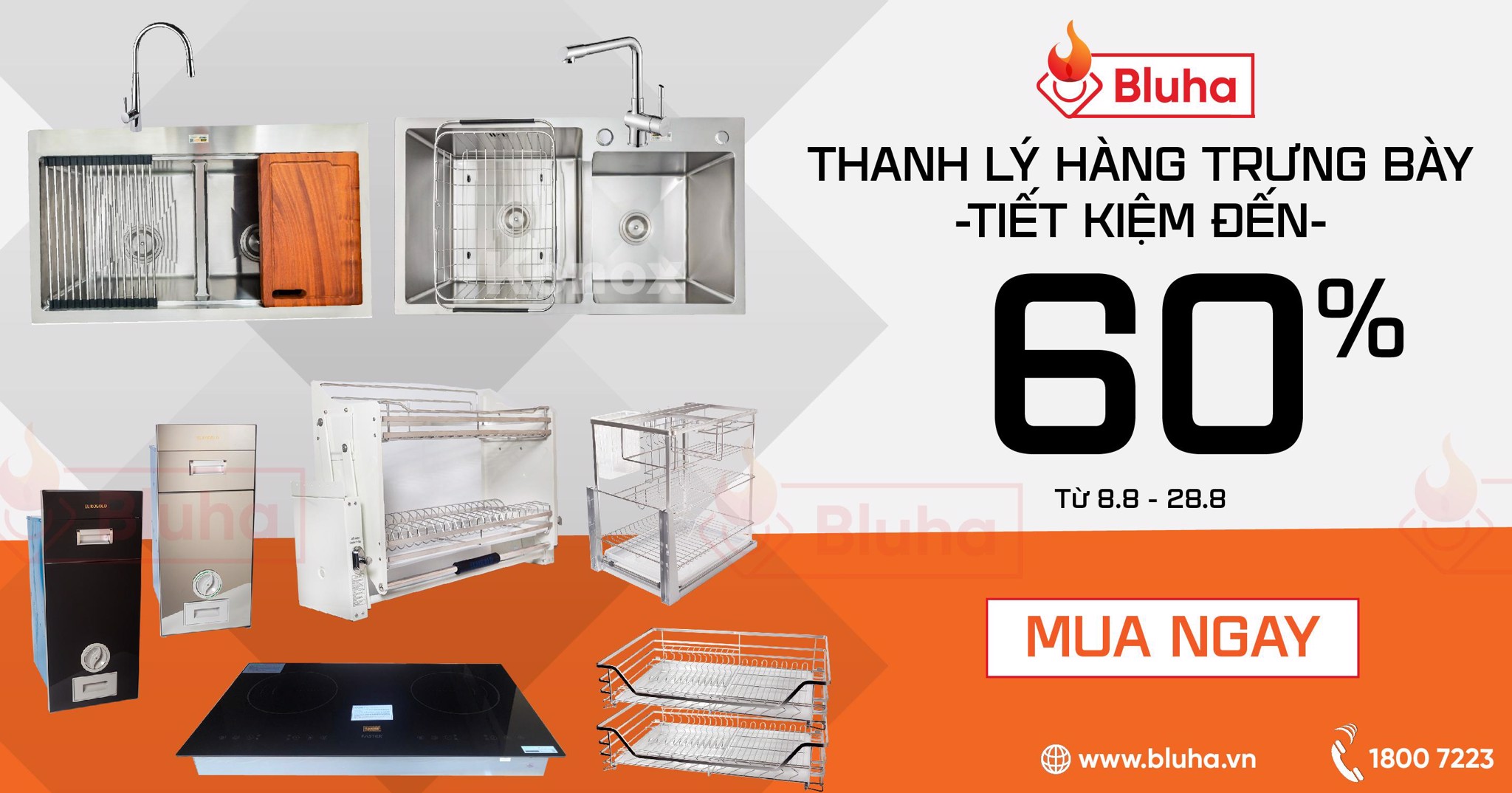Showroom Bluha tại Hoàng Mai, Hà Nội thanh lý TOÀN BỘ sản phẩm phụ kiện, thiết bị bếp cao cấp, chính hãng từ các thương hiệu nổi tiếng như: Eurogold, Hafele, Konox, Grob, Kit Plus, Hafele,...Với các sản phẩm nổi bật như: Giá bát nâng hạ, tay nâng Blum, Chậu vòi Konox, giá xoong nồi bát đĩa đa năng, giá chai lọ dao thớt, thùng gạo thông minh, thùng rác thông minh,...