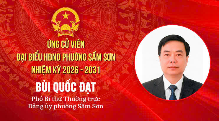 Tiểu sử Ông Bùi Quốc Đạt, Phó Bí thư Thường trực Đảng uỷ phường - Ứng cử viên đại biểu HĐND phường... Uỷ ban Bầu cử phường Sầm Sơn trân trọng giới thiệu tiểu sử Ông Bùi Quốc Đạt, Phó Bí thư Thường trực Đảng uỷ phường tham gia ứng cử đại biểu HĐND phường Sầm Sơn khoá II nhiệm kỳ 2026 - 2031 tại đơn vị bầu cử số 10. -