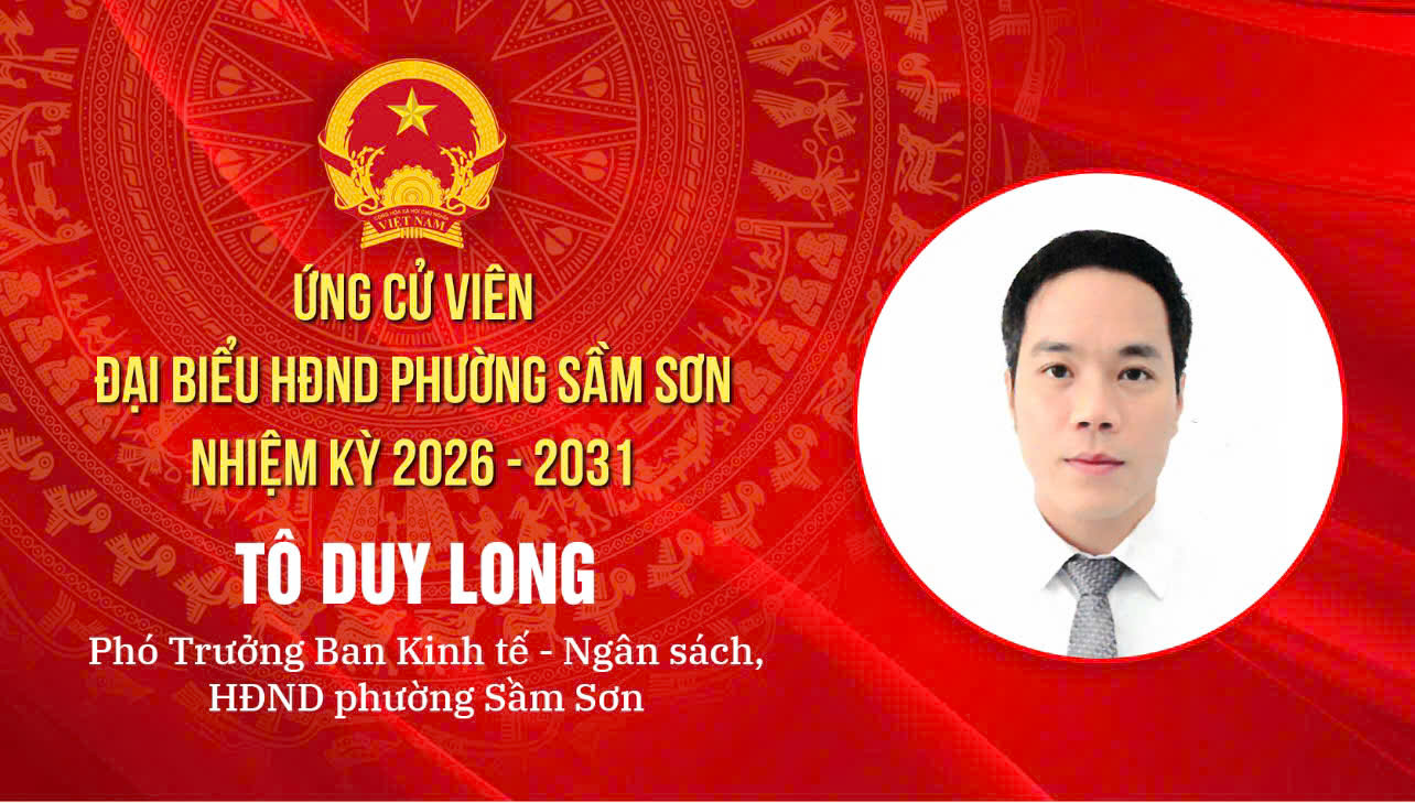 | Tiểu sử Ông Tô Duy Long, Đảng uỷ viên, Phó Trưởng ban Kinh tế - Ngân sách HĐND phường - Ứng cử viên đại biểu HĐND phường Sầm Sơn khoá II nhiệm kỳ 2026 – 2031 Tiểu sử Ông Bùi Quốc Đạt, Phó Bí thư Thường trực Đảng uỷ phường - Ứng cử viên đại biểu HĐND phường Sầm Sơn khoá II nhiệm kỳ 2026 – 2031 Tiểu sử Bà Hoàng Thị Thuỳ Dương, Đảng uỷ viên, Phó Chủ tịch Ủy ban MTTQ Việt Nam phường, Chủ tịch Hội LHPN phường - Ứng cử viên đại biểu HĐND phường Sầm Sơn khoá II nhiệm kỳ 2026 – 2031 Tiểu sử Ông Lê Huy Hưng, Đảng uỷ viên, Phó Chủ tịch UBND phường - Ứng cử viên đại biểu HĐND phường Sầm Sơn khoá II nhiệm kỳ 2026 – 2031 Tiểu sử Ông Văn Hùng Quang, Uỷ viên Ban Thường vụ Đảng uỷ, Chỉ huy trưởng BCH Quân sự phường - Ứng cử viên đại biểu HĐND phường Sầm Sơn khoá II nhiệm kỳ 2026 – 2031 -