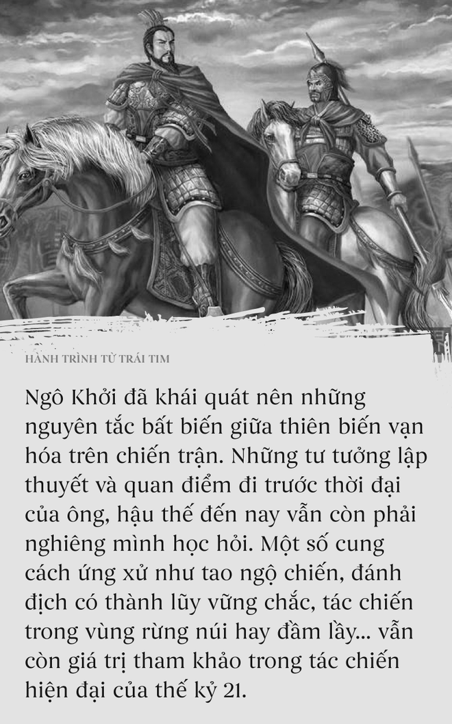Ngô Khởi cầm quân tây tiến. Dù có tàn nhẫn bạc tình với ai nhưng đối với thủ hạ thì Ngô Khởi hết mực đối đãi. Viên đại tướng không ngồi lưng ngựa mà cùng đi bộ với binh sĩ, khoác chiến y sơ sài và cùng ăn chung một nồi với thuộc cấp thấp nhất. Đêm đến thì ông cùng màn trời chiếu đất như lính, không quan cách chút nào. Ngô Khởi thương lính như con. Lòng Trắc ẩn của ông với binh sĩ không phải vì ông muốn họ sống sung sướng mà muốn khiến họ sẵn lòng chết nơi sa trường. Đội quân của ông đánh đâu thắng đó, quân Tần liên tiếp thất bại. Ngô Khởi hạ liền 5 thành.