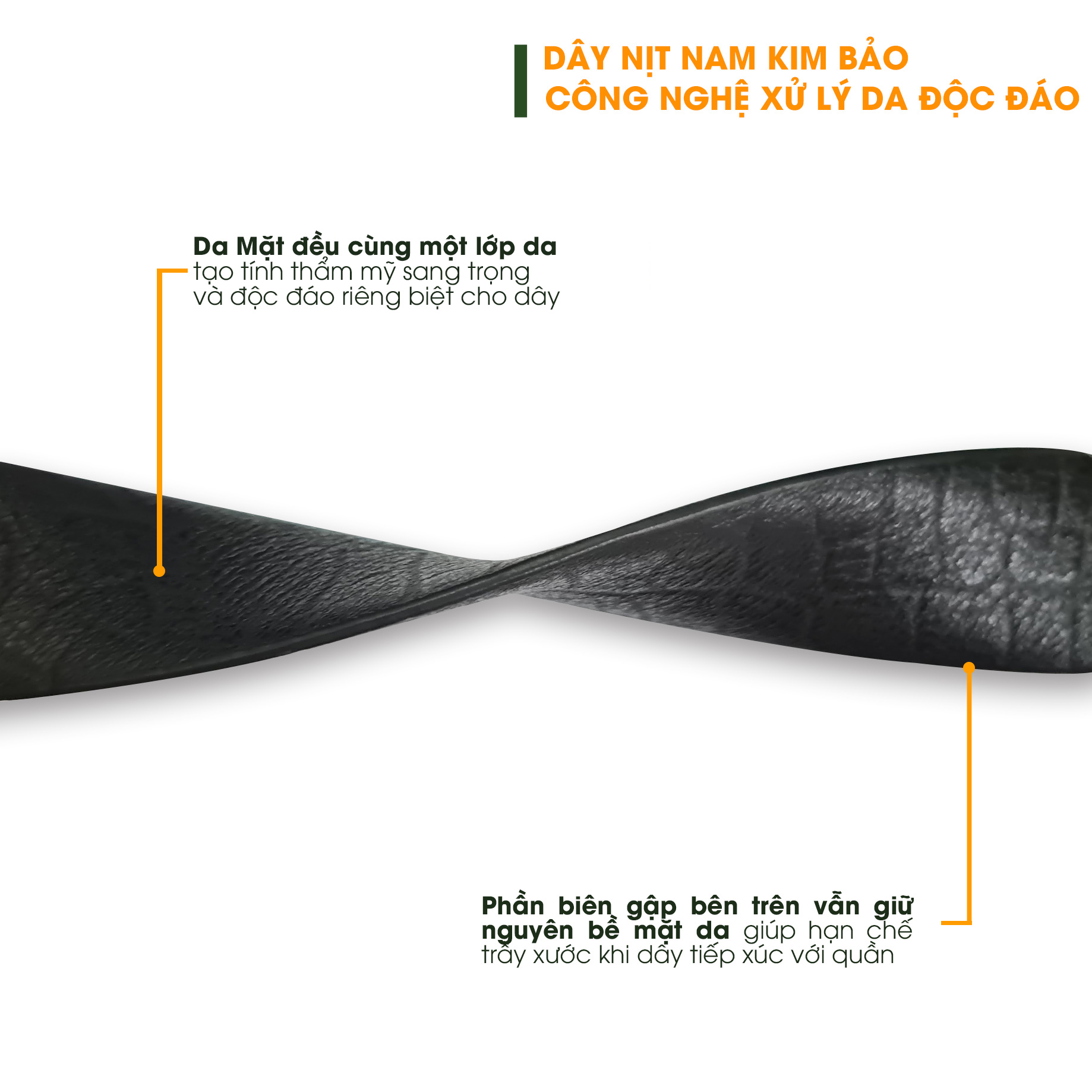 Điểm khác biệt nhất của sản phẩm này chính là ở phần gập của lớp da bên trong và ngoài. 2 lớp này được gập lại từ 1 lớp da và phần biên phía trên là phần gập được giữ nguyên mặt da, giúp hạn chế tối đa trầy xước khi tiếp xúc với quần. Phần biên dưới được sơn tỉ mỉ để cố định phần da của dây nịt.