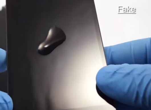 - Đối với màn hình chính hãng khi các bạn nhỏ 1 giọt nước vào màn hình thì giọt nước sẽ tụ lại tròn se, khi các bạn nghiêng máy lên xuống thì giọt nước sẽ chảy đi theo 1 cục chứ không rời rạc ra. Đối với màn hình dõm, màn hình lô thì giọt nước sẽ bị đứt mạnh chứ không tròn như màn hình zin.