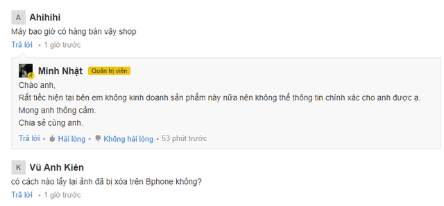 Ở phần comment, khi khách hàng hỏi về lý do ngừng kinh doanh chỉ nhận được câu trả lời rằng việc ngừng kinh doanh ở đây bởi... nhiều lý do. Và vì hiện tại đã ngừng kinh doanh nên Thegioididong cũng không hề có thông tin chính xác cho khách hàng quan tâm tới Bphone về thời điểm có thể bán lại loại điện thoại này.
