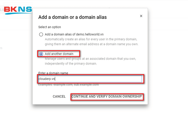 Tiếp theo nhấn Continue và Verify domain ownership.