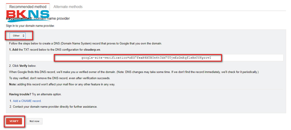 Bước 5: Trong thư mục Sign to your domain name provider nhấn chọn Other. Ở mục Add the TXT record below to the DNS configuration for… bạn tìm TXT record copy sau đó paste vào trang quản lý domain. Tiếp đó bạn nhấn vào Verify để trở lại bảng quản lý.