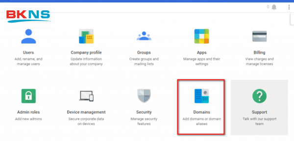 Bước 1: Truy cập website admin.google.com sau đó đăng nhập vào vào Admin console. Tiếp đến chọn thư mục Domains như hình dưới đây: