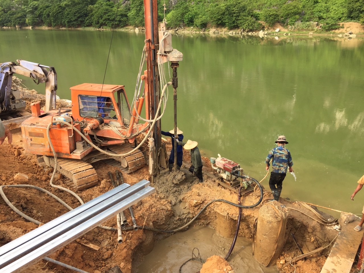 + Thiết bị được tập kết gọn gàng, có sự bố trí hợp lý các vị trí đặt ống đổ bê tông, cần khoan và các thiết bị chuẩn bị thi công.