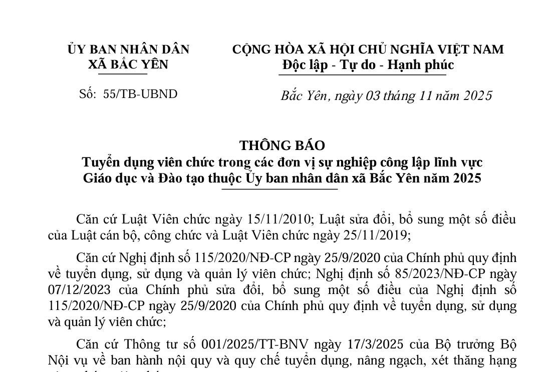 | Thông tin mới nhất BÀI TUYÊN TRUYỀN VỀ CUỘC BẦU CỬ ĐẠI BIỂU QUỐC HỘI KHOÁ XVI VÀ ĐẠI BIỂU HỘI ĐỒNG NHÂN DÂN CÁC CẤP... Phê duyệt danh sách thí sinh đủ điều kiện, không đủ điều kiện tham dự Vòng 2 kỳ tuyển dụng viên... Phê duyệt danh mục tài liệu ôn tập đối với thí sinh tham dự vòng 2 (vấn đáp) kỳ tuyển dụng viên... Thông báo mẫu con dấu, chũ ký, địa chỉ, số điện thoại, địa chỉ Email liên hệ công tác của ủy ban... Thông báo Công bố số Đơn vị bầu cử, danh sách các Đơn vị bầu cử và số lượng đại biểu Hội đồng Nhân... Thông báo về việc nộp hồ sơ ứng cử đại biểu Hội đồng nhân dân xã Bắc Yên khóa II, nhiệm kỳ 2026-2031 Quyết định thành lập các Tổ giúp việc Uỷ ban bầu cử xã Bắc Yên, nhiệm kỳ 2026 - 2031 Kế hoạch Triển khai thực hiện bầu cử đại biểu Quốc hội khóa XVI và đại biểu Hội đồng nhân dân các... Hình thức, thời gian, nội dung sát hạch đánh giá năng lực ngoại ngữ trong kỳ tuyển dụng viên chức... Chương trình nghệ thuật chào năm mới 2026 (Countdown) tại tỉnh Quảng Ninh THÔNG BÁO Tổ chức Hội nghị đối thoại giữa Bí thư Đảng ủy, Giám đốc Sở Văn hóa, Thể thao và Du lịch... Kỳ họp chuyên đề thứ 37 của HĐND tỉnh khóa XV, nhiệm kỳ 2021-2026 Thông báo tuyển chọn ứng viên tham gia chương trình thực tập sinh nữ đi thực tập kỹ thuật tại Nhật... Triển khai thực hiện Quyết định số 2249/QĐ-UBND ngày 06/9/2025 của UBND tỉnh; Kế hoạch số 27-KH/ĐU... Kế hoạch tuyên truyền cuộc bầu cử đại biểu Quốc hội khóa XVI và bầu cử đại biểu Hội đồng nhân dân... Quyết định về việc thành lập Ủy ban bầu cử xã Bắc Yên Thông báo về việc bổ sung hình thức nộp hồ sơ tuyển dụng viên chức trong các đơn vị sự nghiệp... Nghị quyết về điều chỉnh, thu hồi dự toán chi ngân sách nhà nước năm 2025 Số hóa hồ sơ – Bước đi quan trọng trong hiện đại hóa nền hành chính cơ sở Bản tin cải cách hành chính số 41 Bản tin cải cách hành chính số 40 Bản tin cải cách hành chính số 39 Bản tin cải cách hành chính số 38 Thông báo Tuyển dụng viên chức trong các đơn vị sự nghiệp công lập lĩnh vực Giáo dục và Đào tạo... Định danh điện tử VNeID – Nền tảng thiết yếu của công dân số NGÀY HỘI VIỆC LÀM XÃ BẮC YÊN NĂM 2025 Xây dựng Chính quyền số – Nâng cao hiệu lực, hiệu quả phục vụ Nhân dân CHUYỂN ĐỔI SỐ BẮC YÊN – VÌ CUỘC SỐNG TIỆN LỢI HƠN, MINH BẠCH HƠN, HIỆU QUẢ HƠN V/v triển khai chương trình học bổng cho học sinh/sinh viên hệ Cao đẳng có hoàn cảnh khó khăn Báo cáo công khai tình hình thực hiện dự toán ngân sách xã 9 tháng đầu năm 2025 Tuyên truyền về Bộ nhận diện hưởng ứng Ngày Chuyển đổi số quốc gia năm 2025 Bản tin cải cách hành chính số 37 Bản tin cải cách hành chính số 36 Quyết định về việc sửa đổi khoản I, Điều 1 Nghị quyết số 07/NQ-HĐND ngày 01/7/2025 của Hội đồng... Nghị quyết Phân bổ chi tiết dự toán chi thường xuyên thực hiện các Chương trình mục tiêu quốc gia... Nghị quyết về giao bổ sung dự toán ngân sách nhà nước năm 2025 Nghị quyết về điều chỉnh tăng dự toán ngân sách nhà nước đã chi 6 tháng đầu năm 2025 tại các đơn vị... BÌNH DÂN HỌC VỤ SỐ - NỀN TẢNG CHO SỰ PHÁT TRIỂN TRONG KỶ NGUYÊN SỐ UBND xã Bắc Yên phối hợp Đoàn xã Bắc Yên phối hợp Công an xã thu nhận tài khoản định danh điện tử... Quyết định về việc tạm hoãn, miễn gọi nhập ngũ và thực hiện nghĩa vụ tham gia Công an nhân dân năm... Báo cáo tình hình thực hiện công tác cải cách hành chính quý III; phương hướng, nhiệm vụ CCHC quý... Bản tin cải cách hành chính số 35/2025 Chuyển đổi số – Động lực quan trọng thúc đẩy phát triển kinh tế – xã hội xã Bắc Yên Bản tin Cải cách hành chính số 34 Triển khai phong trào Bình dân học vụ số trên địa bàn xã Bắc Yên Bản tin Cải cách hành chính số 33/2025 Bản tin Cải cách hành chính số 32/2025 Thông báo Chương trình hoạt động Văn hóa Văn nghệ - Thể dục thể thao. Chào mừng kỷ niệm 80 năm Cách... Bản tin Cải cách hành chính số 31/2025 Dịch vụ công trực tuyến – Giải pháp thuận tiện, minh bạch cho mọi người dân Thống kê truy cập - Đang online: 1