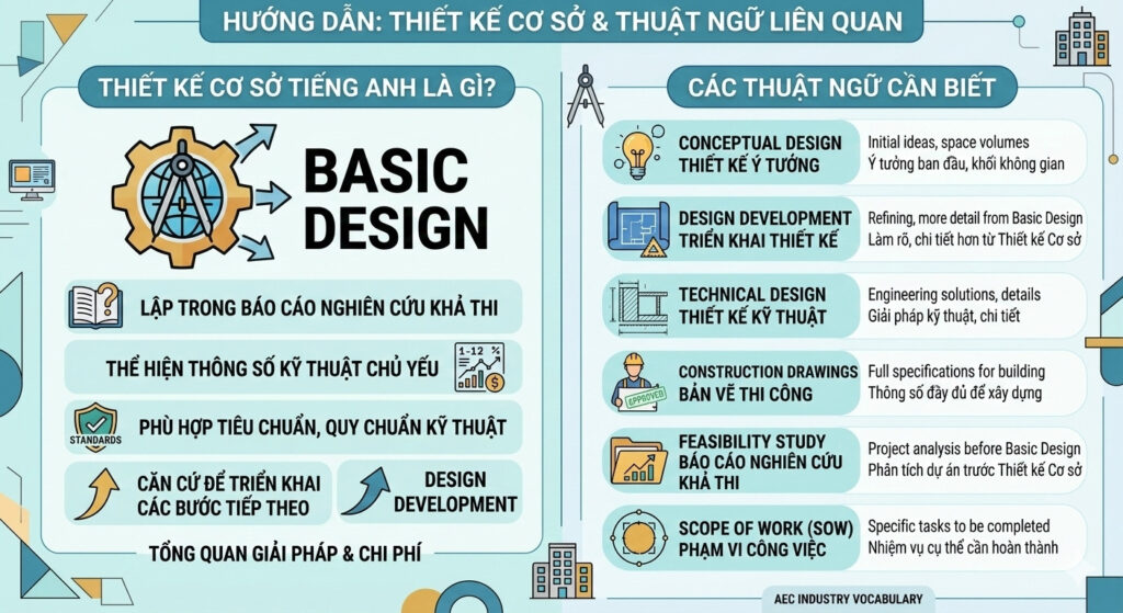 “Thiết kế cơ sở tiếng Anh là basic design là giai đoạn đầu của quá trình thiết kế và cũng là nền tảng để phát triển thiết kế chi tiết.”