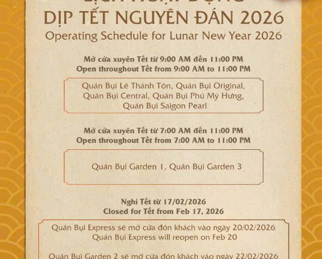 [English below] Quán Bụi xin gửi đến quý khách hàng lịch hoạt động dịp tết Nguyên...
