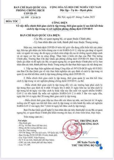 Ngày 05/5/2021 Ban chỉ đạo Quốc gia phòng chống dịch COVID-19 đã ban hành Công điện số 600/CĐ-BCĐ về việc điều chỉnh thời gian cách ly tập trung, thời gian quản lý sau khi kết thúc cách ly tập trung và xét nghiệm phòng chống dịch COVID-19.