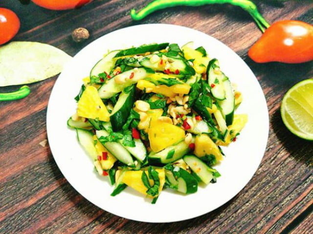 Món ăn này khá đơn giản, bạn chỉ cần chuẩn bị 3 quả dưa chuột đã thái lát nhỏ, 1 bát nhỏ cà rốt đã tỉa hình hoa và thái thành những lát mỏng, rau thơm, lạc, ớt, tỏi, chanh, giấm, đường, ½ trái thơm gọt vỏ đã cắt thành miếng dày 1-2 cm. Để cho ra món nộm ngon, bạn chỉ cần cho tất cả nguyên liệu vào trộn cùng, để ủ khoảng 20 phút cho ngấm gia vị rồi cho ra đĩa, trang trí là xong.