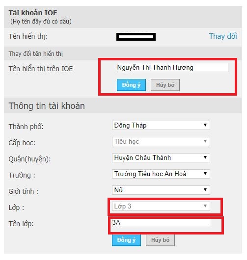 - Tên hiển thị: học sinh cần điền họ tên đầy đủ có dấu như trong giấy khai sinh để hệ thống cập nhật thông tin chính xác đảm bảo quyền lợi cho thí sinh khi tham gia thi.