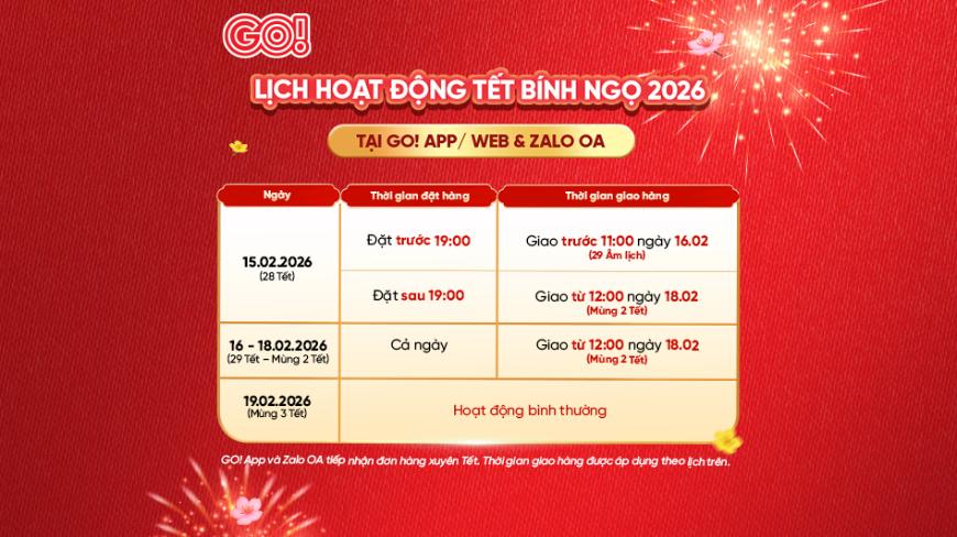 GO! thông báo lịch đặt hàng và giao hàng Tết 2026 khi mua sắm online trên GO! App, Website và Zalo OA