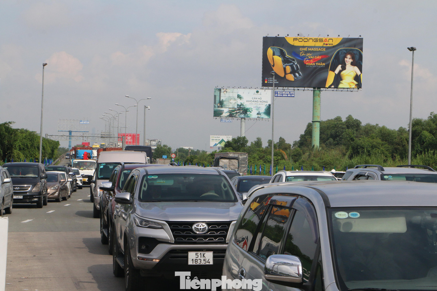 | Hàng nghìn phương tiện xếp hàng gần 4km di chuyển qua trạm thu phí Long Phước. |