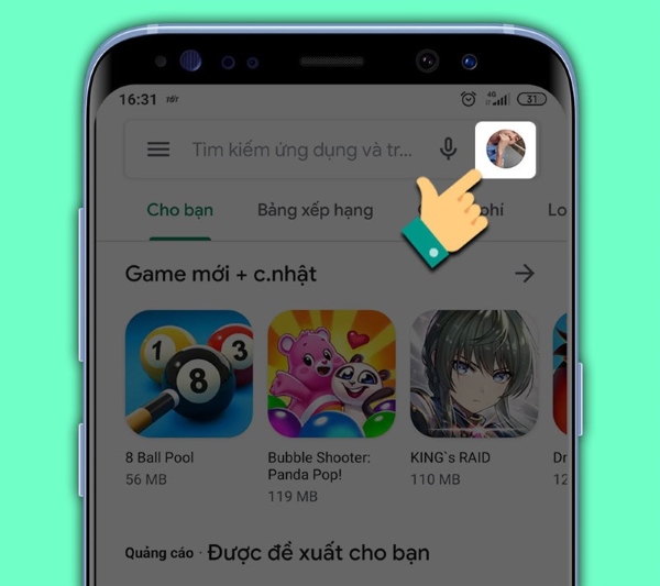 Bước 1: Mở ứng dụng CH Play trên điện thoại > chọn vào biểu tượng trang cá nhân trên thanh tìm kiếm.