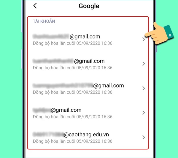 Bước 5: Nhấn vào Google. Trên màn hình mới hiện ra, bạn nhấn vào mục tài khoản Gmail của bạn.