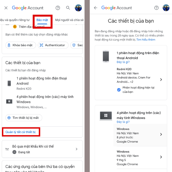Bước 6: Nhấn chọn thẻ “Bảo mật” > sau đó kéo xuống mục “Các thiết bị của bạn” > chọn “Quản lý tất cả thiết bị”.