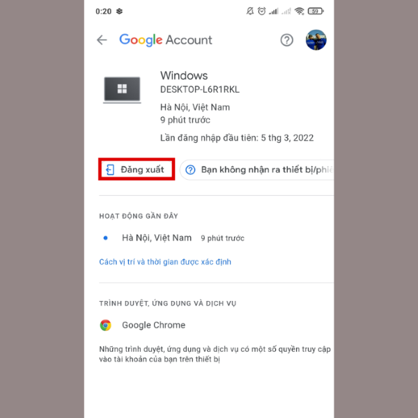 Bước 8: Ngoài ra, người dùng còn có thể kiểm tra được thời gian tài khoản Google hoạt động gần đây nhất. Sau đó, bạn nhấn “Đăng xuất” để thoát tài khoản Google từ xa trên thiết bị khác.