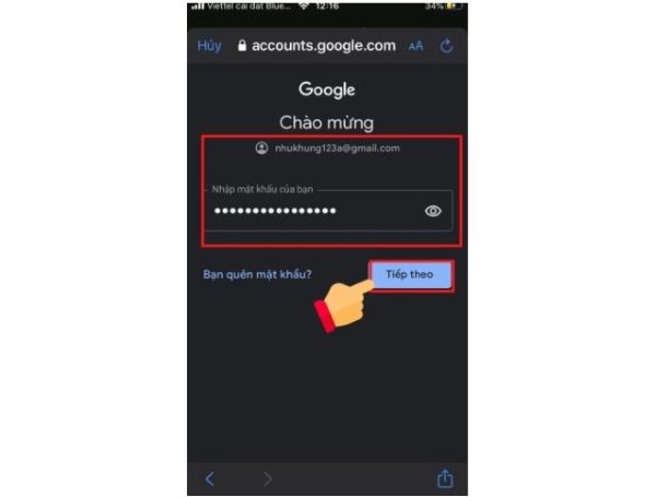 Bước 4: Nhập mật khẩu và địa chỉ Gmail của bạn > chọn vào Tiếp theo.