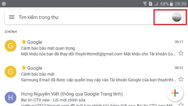 Bước 1: Trên điện thoại Samsung, bạn mở vào ứng dụng Gmail > nhấn vào hình đại diện của người dùng trên góc phải.