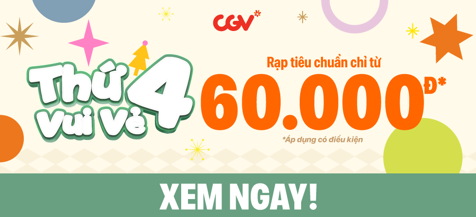 HAPPY WEDNESDAY - THỨ TƯ VUI VẺ - GIÁ VÉ CHỈ TỪ 60.000Đ vào mỗi Thứ Tư hàng tuần, bạn sẽ được tận hưởng những bộ phim siêu phẩm với giá cực ưu đãi. Nào, hãy đến CGV ngay để nạp lại năng lượng mà không cần chờ đến cuối tuần nhé!