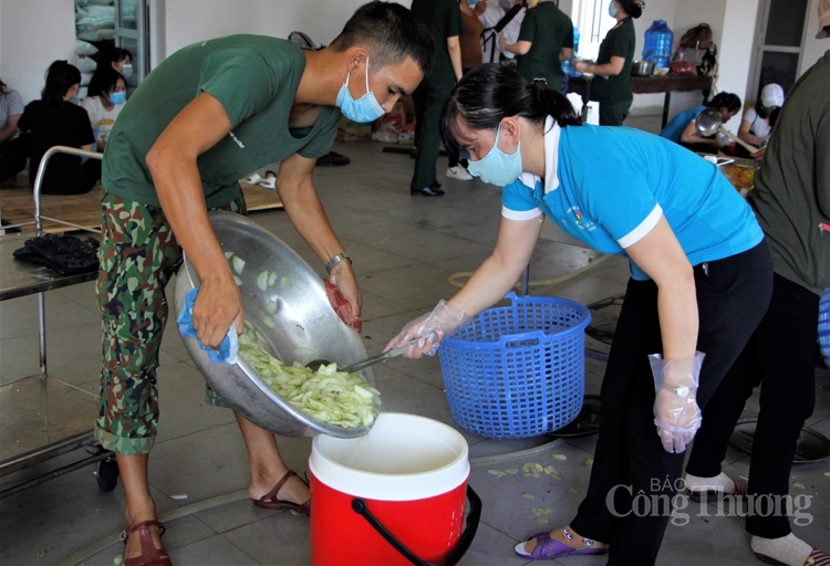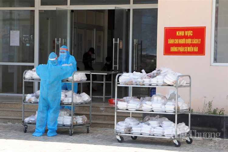 | Cơm được các cán bộ, chiến sĩ đưa tới khu vực dành cho người được cách ly |