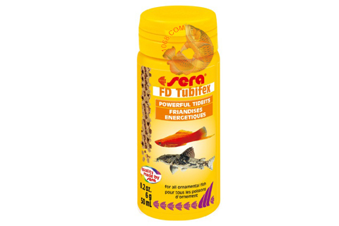 - Sera FD Tubifex thức ăn cho cá sống tầng đáy. Tubifex chủ yếu sống trong lòng đất , do đó là một món ăn thật đặc biệt đối với cá sống và ăn ở tầng đáy hồ. Do quá trình sản xuất đặc biệt, đông khô Tubifex - không giống như thức ăn đông lạnh cho cá cảnh - không có ký sinh trùng và các mầm bệnh, các thành phần có giá trị được giữ lại.