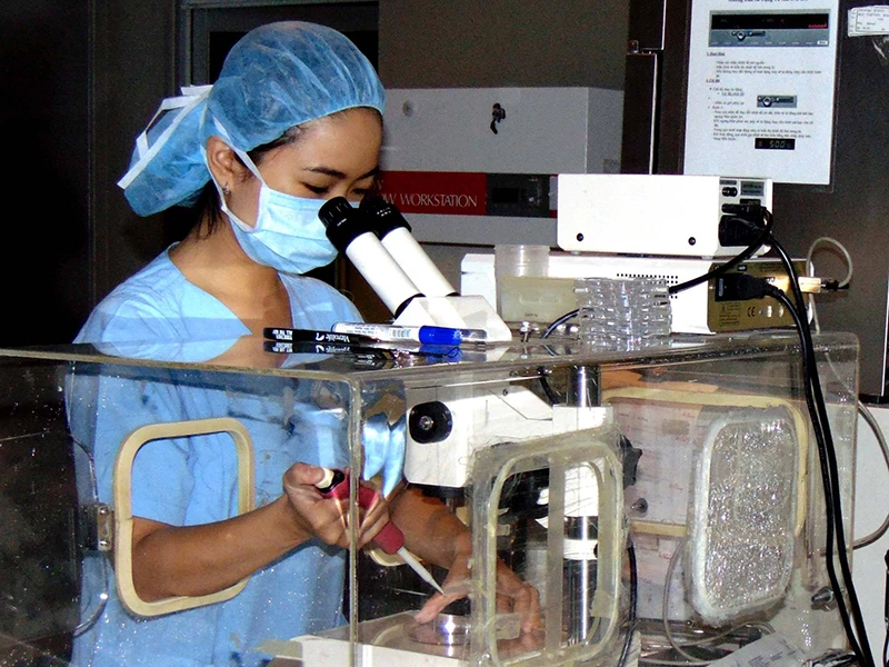 Nhân viên y tế BV Từ Dũ TP.HCM đang xét nghiệm chất lượng trứng của một phụ nữ hiếm muộn. Ảnh: TRẦN NGỌC