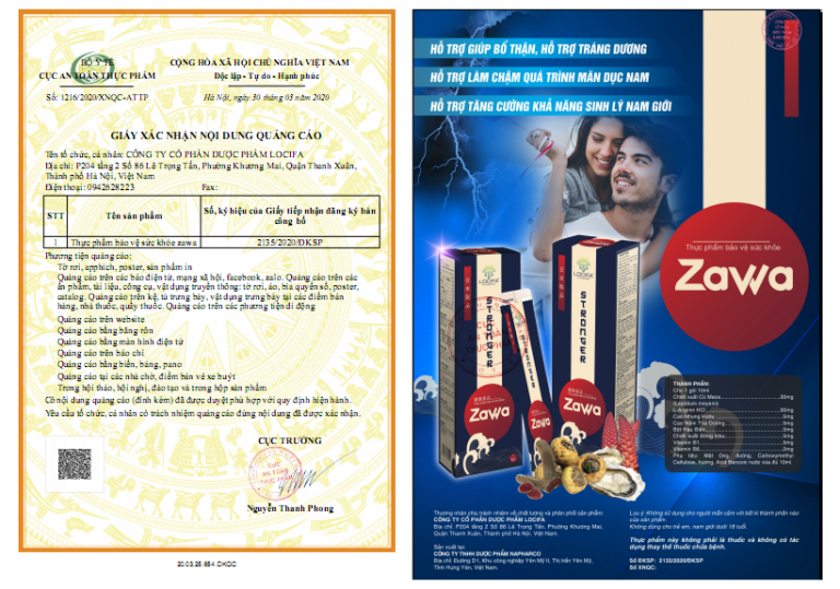 Thâm chí, các trang web này còn công khai hình ảnh giấy xác nhận nội dung quảng cáo đối với sản phẩm Zawa này. Vậy, Cục an toàn thực phẩm có xác nhận nội dung quảng cáo vi phạm Luật này không? Với hàng loạt những điểm vi phạm nghiệm trọng Luật quảng cáo, “thổi phồng” công dụng, Công ty Lofica có đang qua mặt các cơ quan chức năng, trong khi bản đăng ký của họ chỉ là sản phẩm bảo vệ sức khỏe. Điều mà nội dung thể hiện rất rõ trong bản công bố sản phẩm đăng ký của Locifa.
