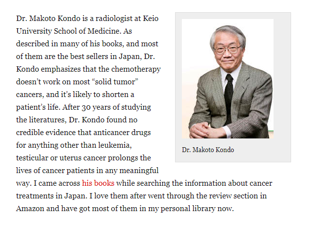 Tiến sĩ Makoto Kondo là bác sĩ tại Đại học Y khoa Keio. Ông có kinh nghiệm hơn 40 năm điều trị ung thư, chuyên gia xạ trị của bệnh viện Đại học Keio. Ông được biết tới là tác giả của hàng loạt cuốn sách bán chạy, như “Ung thư đừng vội phẫu thuật”, “Bệnh nhân ơi, không nên đấu tranh với ung thư”, “Liệu pháp tự bỏ mặc phát triển trong điều trị ung thư”… Năm 2012, ông giành giải thưởng Kikuchi Kan Prize cho sự đóng góp to lớn của văn hóa Nhật Bản. Chuyên ngành nghiên cứu của ông cũng không hề liên quan đến sinh lý nam khoa hay hiếm muộn.