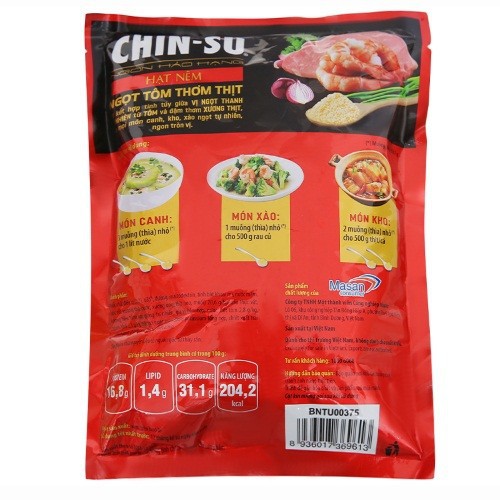 Hạt nêm ngọt tôm thơm thịt Chin-su là sự kết hợp tinh túy giữa vị ngọt thanh tự nhiên từ tôm và đậm thơm xương thịt. Hạt nêm giúp mang đến cho mọi món canh, kho, xào vị ngọt tự nhiên, ngon tròn vị. Sản phẩm có cấu trúc hạt nhỏ, dễ dàng tan và ngấm đều khi nêm nếm. Trọng lượng 2kg