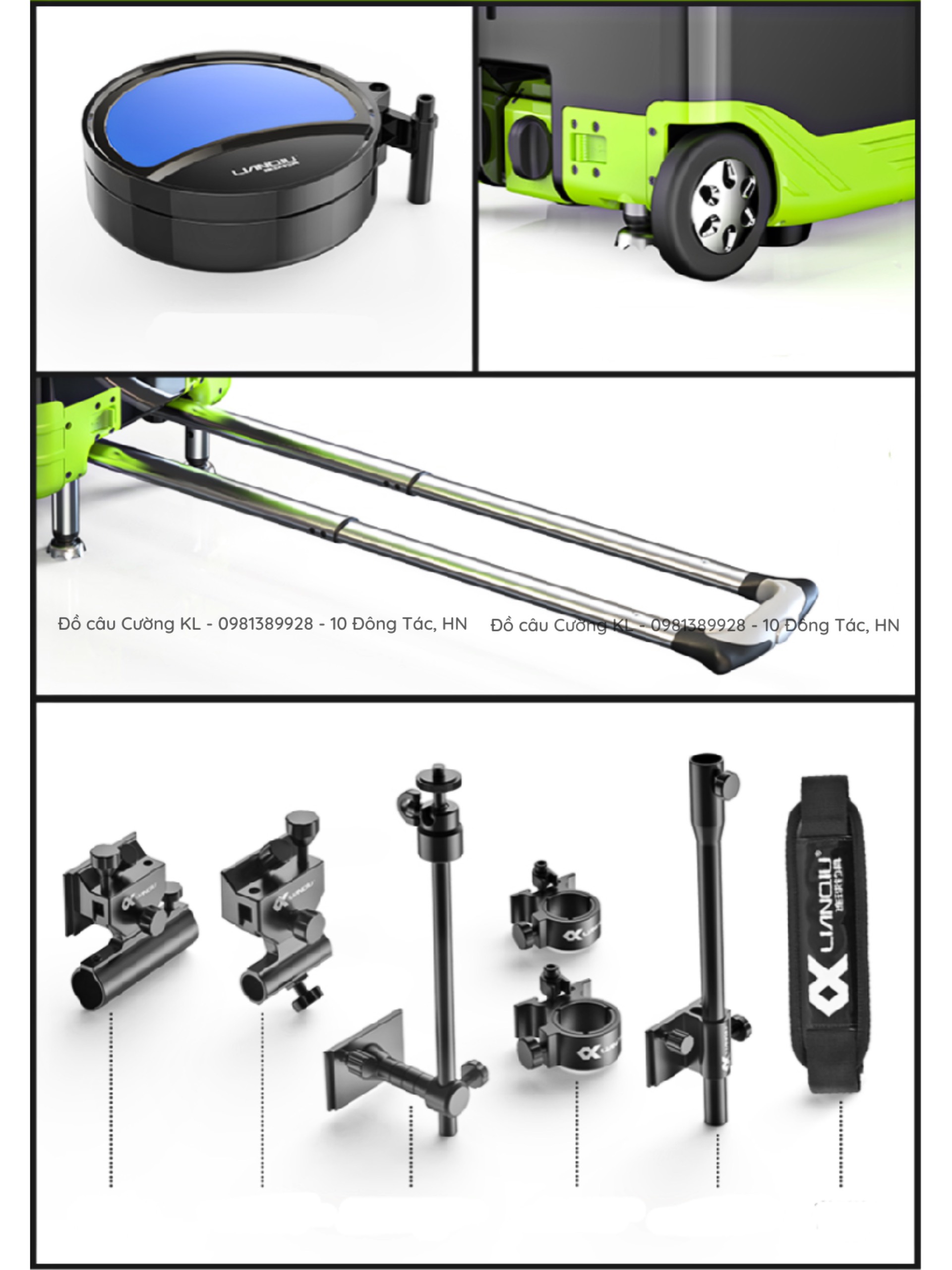 Phụ kiện Chính đi kèm : Bát đựng mồi + gài trống cần + gài rọng cá + Gài bát mồi + Pat đèn + Pat ô + Dây đeo + Hộp đựng phụ kiện