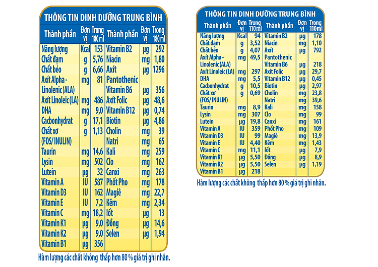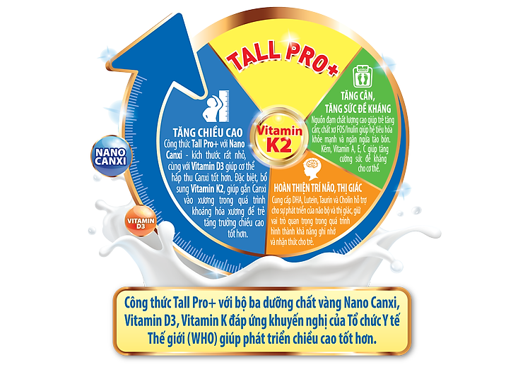 - Công dụng:+ Tăng chiều cao: Công thức Tall Pro¬¬+ với Nano Canxi – kích thước rất nhỏ, cùng với Vitamin D3 giúp cơ thể hấp thu Canxi tốt hơn. Đặc biệt, bổ sung Vitamin K2, giúp gắn Canxi vào xương trong quá trình khoáng hóa xương để trẻ tang trưởng chiều cao tốt hơn.+ Hoàn thiện trí não và thị giác: Cung cấp DHA, Lutein, Taurin và Cholin hỗ trợ hoàn thiện não bộ và võng mach mắt, giúp trẻ tăng cường khả năng ghi nhớ và học hỏi.+ Tăng cân, tăng sức đề kháng: Nguồn Đạm chất lượng cao giúp trẻ tăng cân hợp lý, chất xơ Foss/Inulin giúp hệ tiêu hóa và ngăn ngừa táo bón. Sắt, Kẽm, Vitamin A, E, C với hàm lượng thích hợp giúp tăng cường sức đề kháng cho cơ thể.- Đối tượng sử dụng: Dành cho trẻ trên 1 tuổi- Quy cách đóng gói: Hộp 110ml và 180ml